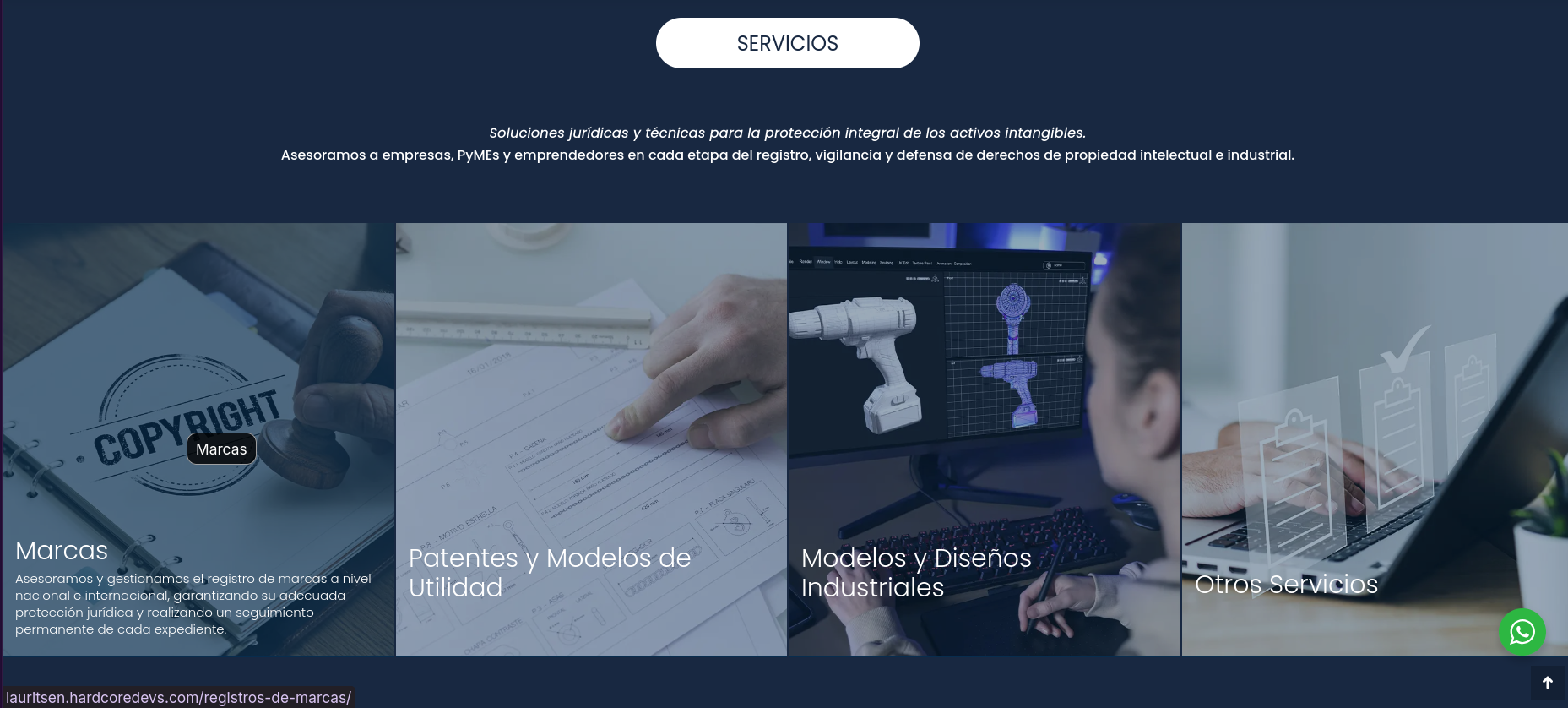 Botón "quiero proteger mi marca" dirige a dirección lauritsen.hardcoredevs.com |
