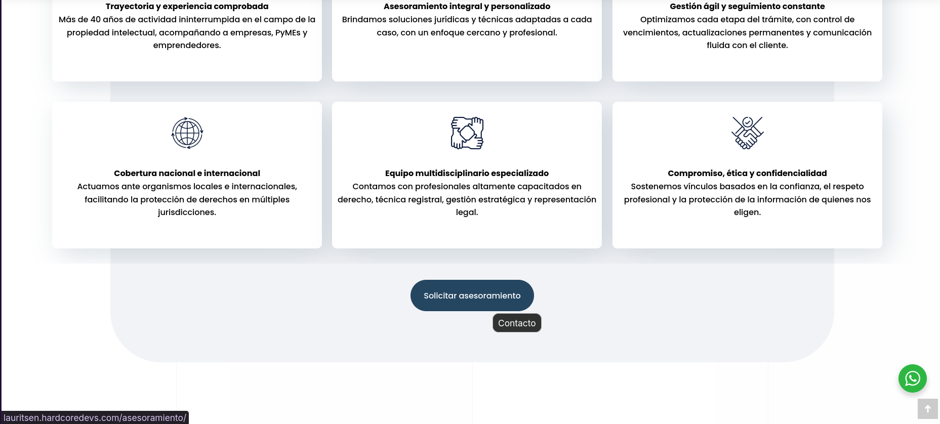 Home, sección "¿por qué elegirnos?" Botón "Solicitar asesoramiento" dirige a lauritsen.hardcoredevs.com |